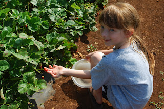 I've wanted to take the girls to pick strawberries for awhile now.... We finally went! We had a ball and the girls LOVED it! I think its important that they see how foods we eat are grown and made. I think they found the strawberry plants fascinating. What kids doesn't love dirt! Strawberry picking is dir-ty! Ava went along picking strawberries and eating them... Then she moved on to eating clumps of dirt... Yum! I will never understand the mind of a toddler! We bought 4 1/2 lbs of fresh strawberries for $5.30. They are DELICIOUS!